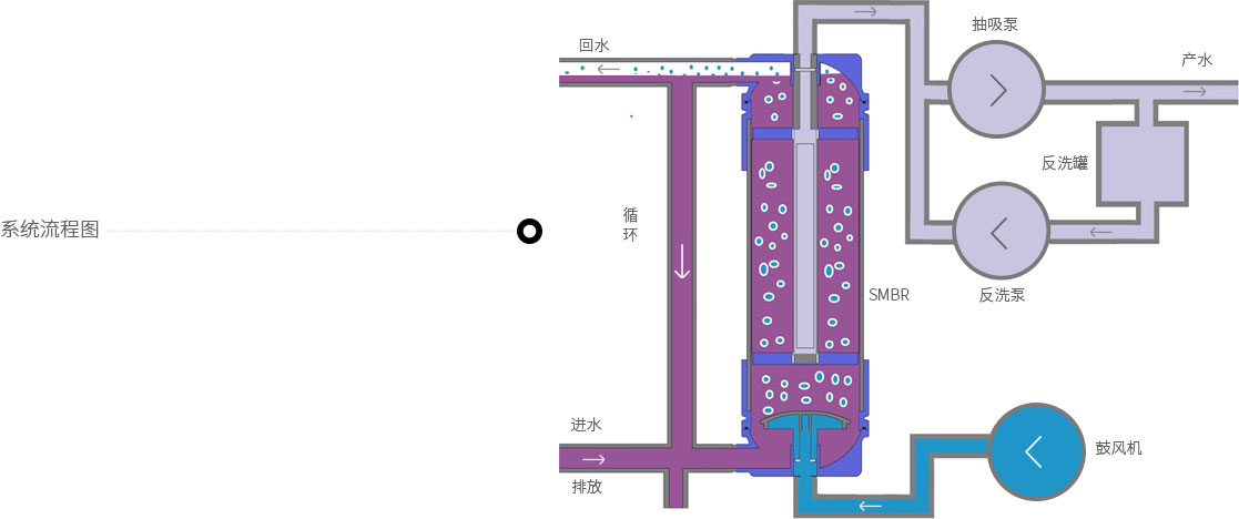 SMBR 是一種浸沒式,真正可反洗卷式膜,適用于工業(yè)廢水和工藝用水。SMBR 是在傳統(tǒng)卷式膜的基礎(chǔ)上增加曝氣擦洗,從透過液側(cè)提供壓力和流量進行反洗的創(chuàng)新性產(chǎn)品。它的最大優(yōu)勢在于無需在供給側(cè)提供高耗能的壓力和流量,而僅在透過液側(cè)按相應(yīng)產(chǎn)能提供抽吸能量。同時,它可與中空纖維膜按同樣的反洗頻次進行反洗。